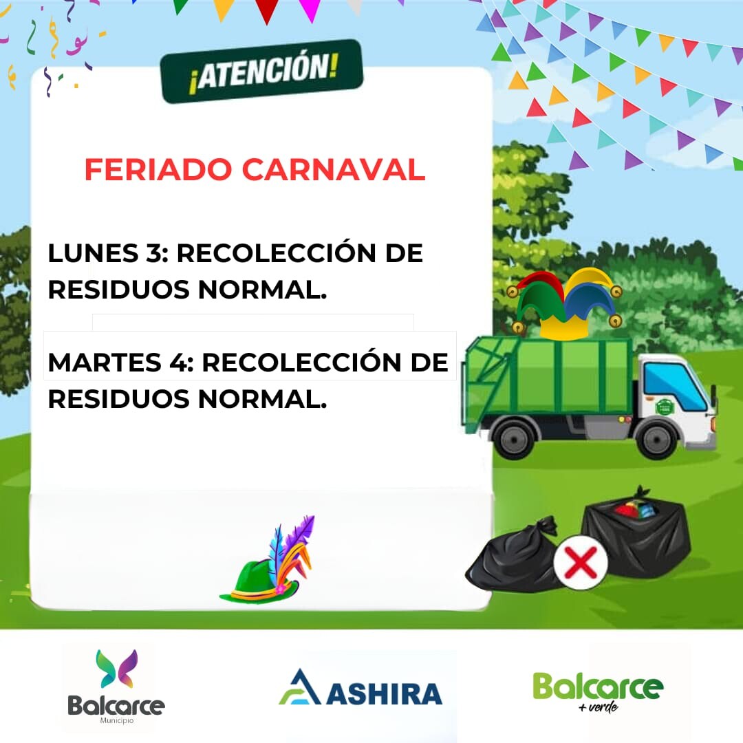 Con el objetivo de garantizar una correcta disposición de los residuos durante el feriado de Carnaval, se informa que la recolección se realizará de manera normal los siguientes días: